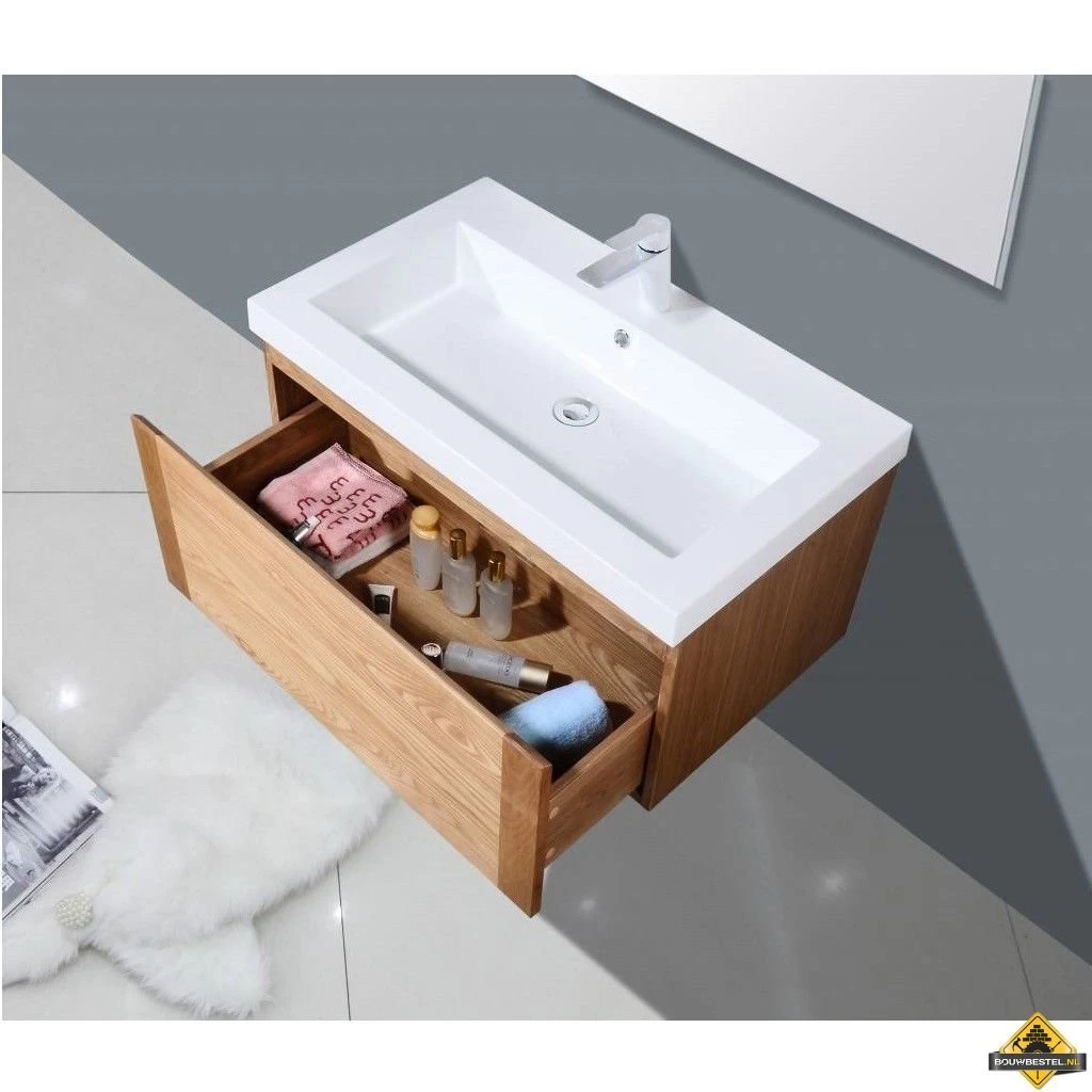 Deze complete badmeubelset bevat een onderkast met soft-close lade, wastafel en een spiegel. De set heeft een afmeting van 80 x 47 x 38 centimeter. Bij dit badmeubel krijgt u bovendien een voor sanitair unieke 5 jaar productgarantie!