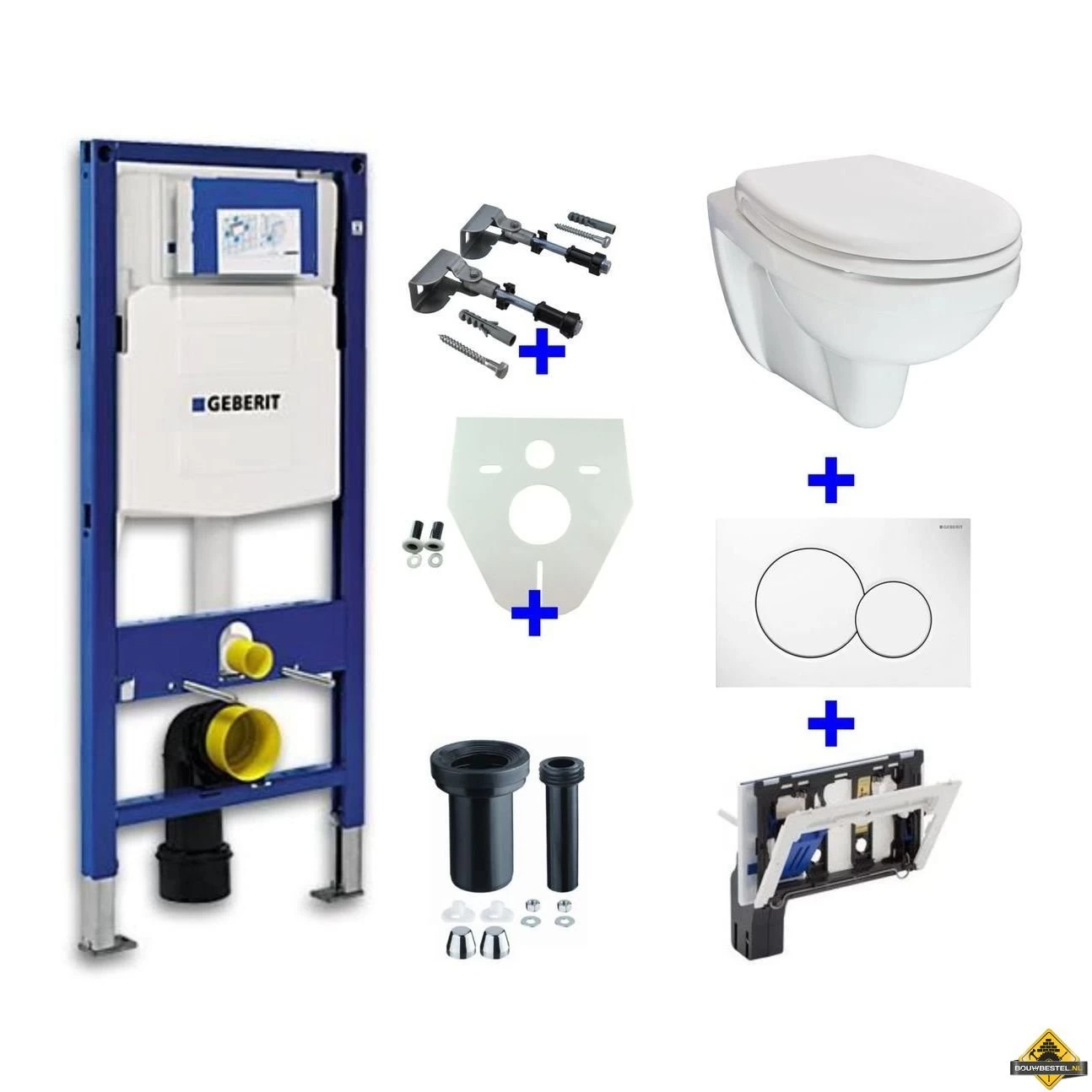Een complete Geberit UP-320 set met inbouwreservoir en muurbevestigingset. Deze set is ook geschikt voor een hoekopstelling. De set wordt geleverd inclusief Geberit toiletblokhouder, Trevi One Pack KIWA wandcloset 49cm met softclose zitting, Sigma 01 drukplaat wit en isolatiematje.