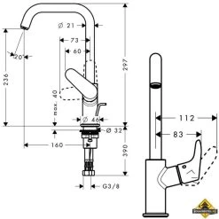 De uitloop heeft een voorsprong van 160 mm. De kraan vormt een normale straal. Dankzij EcoSmart bespaart u tot maar liefst 60% water en verbruikt de kraan niet meer dan 5 liter water per minuut. De kraan functioneert door middel van een duurzaam keramisch kardoes. De kraan is voorzien van een G 1 ¼ afvoergarnituur met een trekstang. De uitloop heeft een draaibereik van 120°. De montage is eenvoudig dankzij de G ⅜ flexibele aansluitslangen.