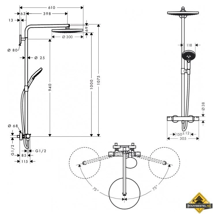 De douchekop heeft een oppervlakte van 300 mm en vormt een ‘RainAir’ volle zachte regenstraal en een ‘Rain’ krachtige regenstraal. De afdekplaat is volledig verchroomd. De douche-arm is 460 mm lang. De SafetyStop temperatuurbegrenzing bij 40°C voorkomt verbranding aan te heet water. Bediening door draaien aan de grepen. Opbouwmontage op de wand. Installatie met hartafstand 150 mm ± 12 mm. Handdouchehouder in hoogte verstelbaar.