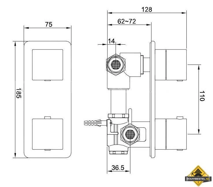 Afmeting bodemplaat: 75 mm x 185 mm