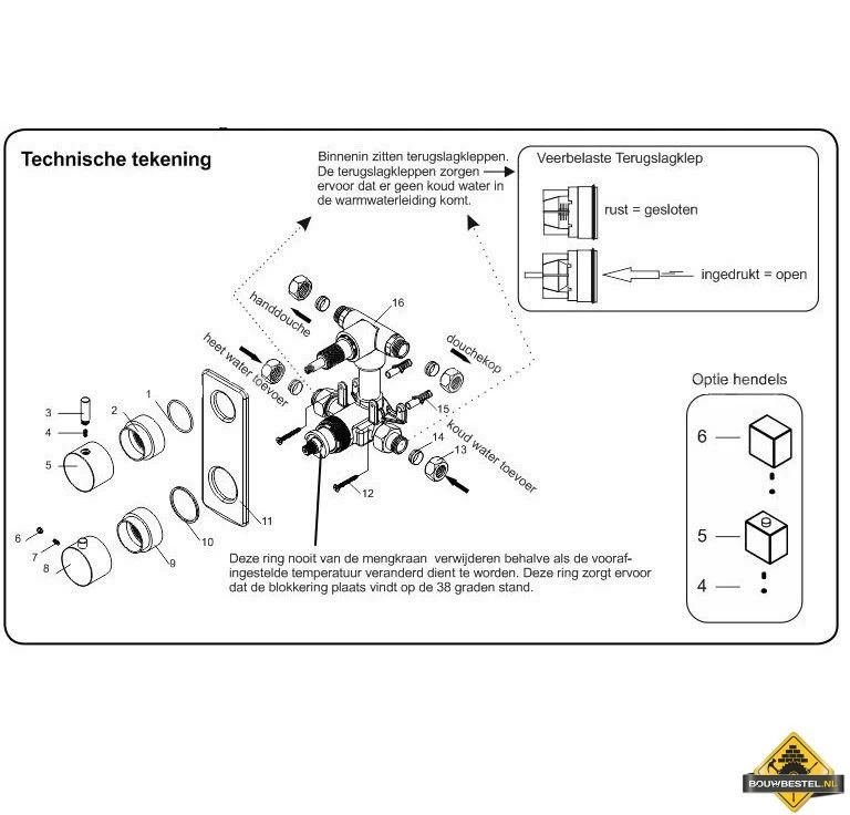 Met de bovenste knop kunt kiezen tussen de hoofddouche en de handdouche. Met de onderste knop verstelt u de temperatuur. De temperatuur is begrenst op 38°C.