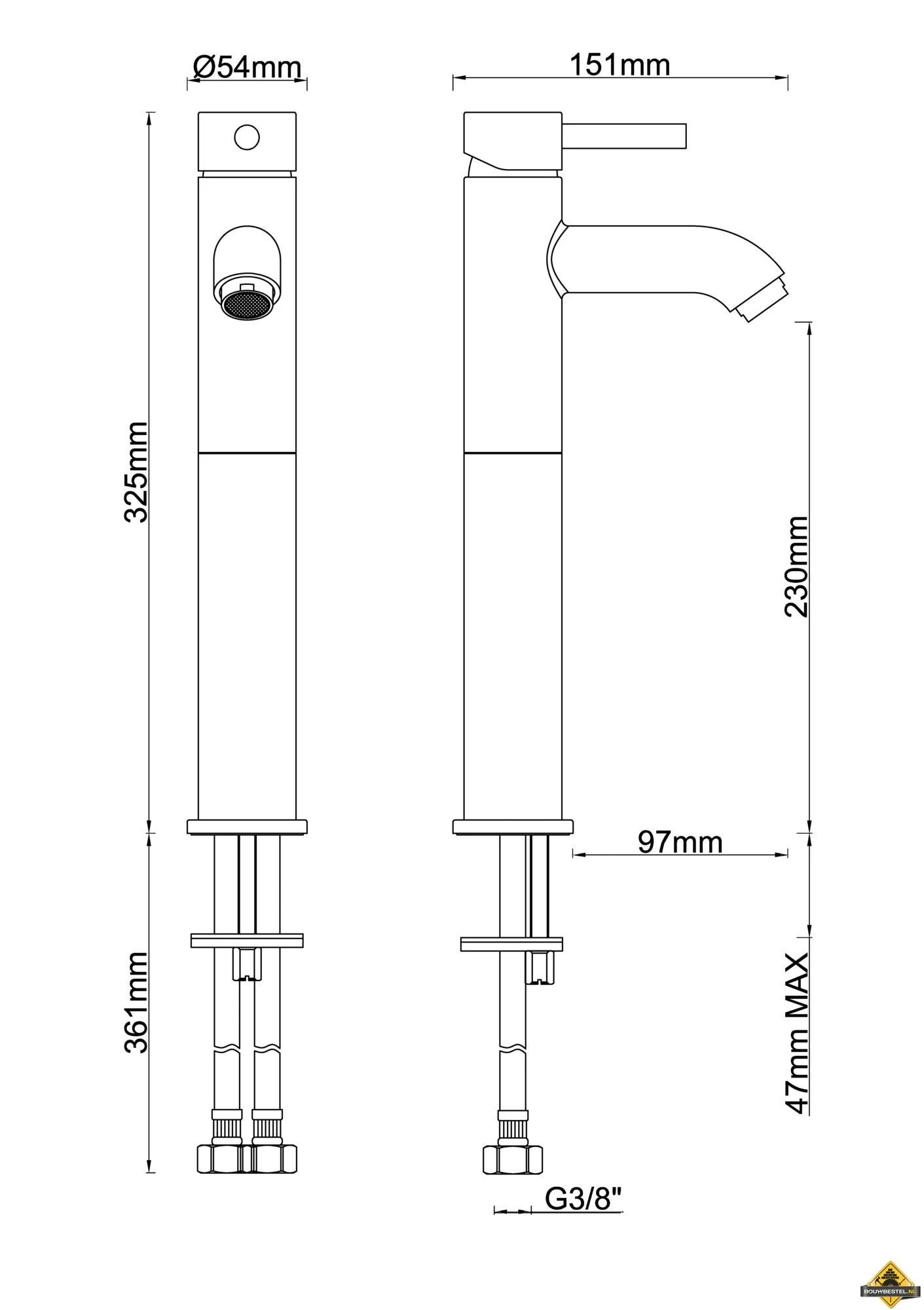 Hoogte kraan is 32.5 cm.