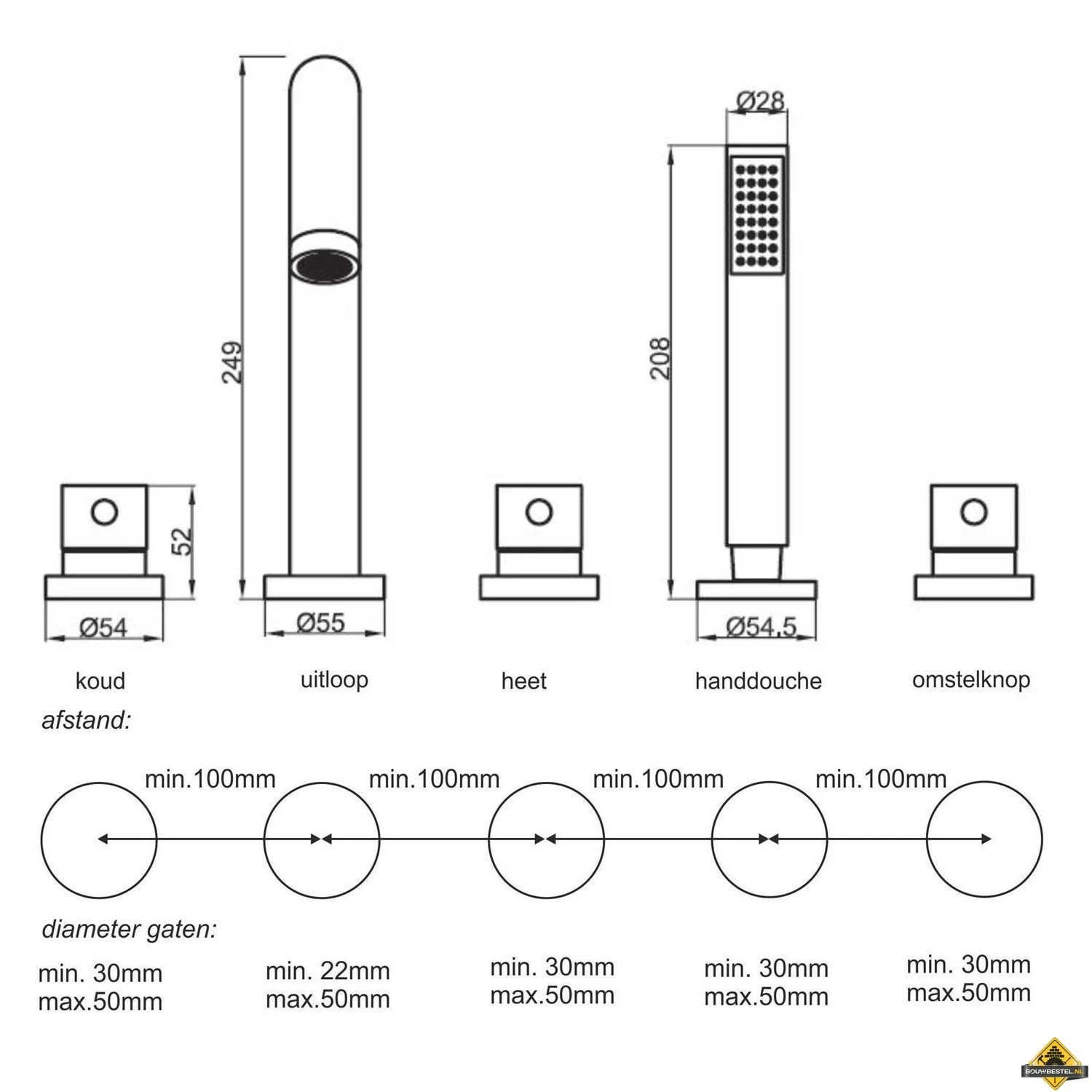 - 2 stuks bedieningsknoppen, (warm en koud)