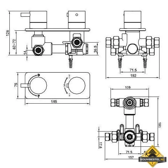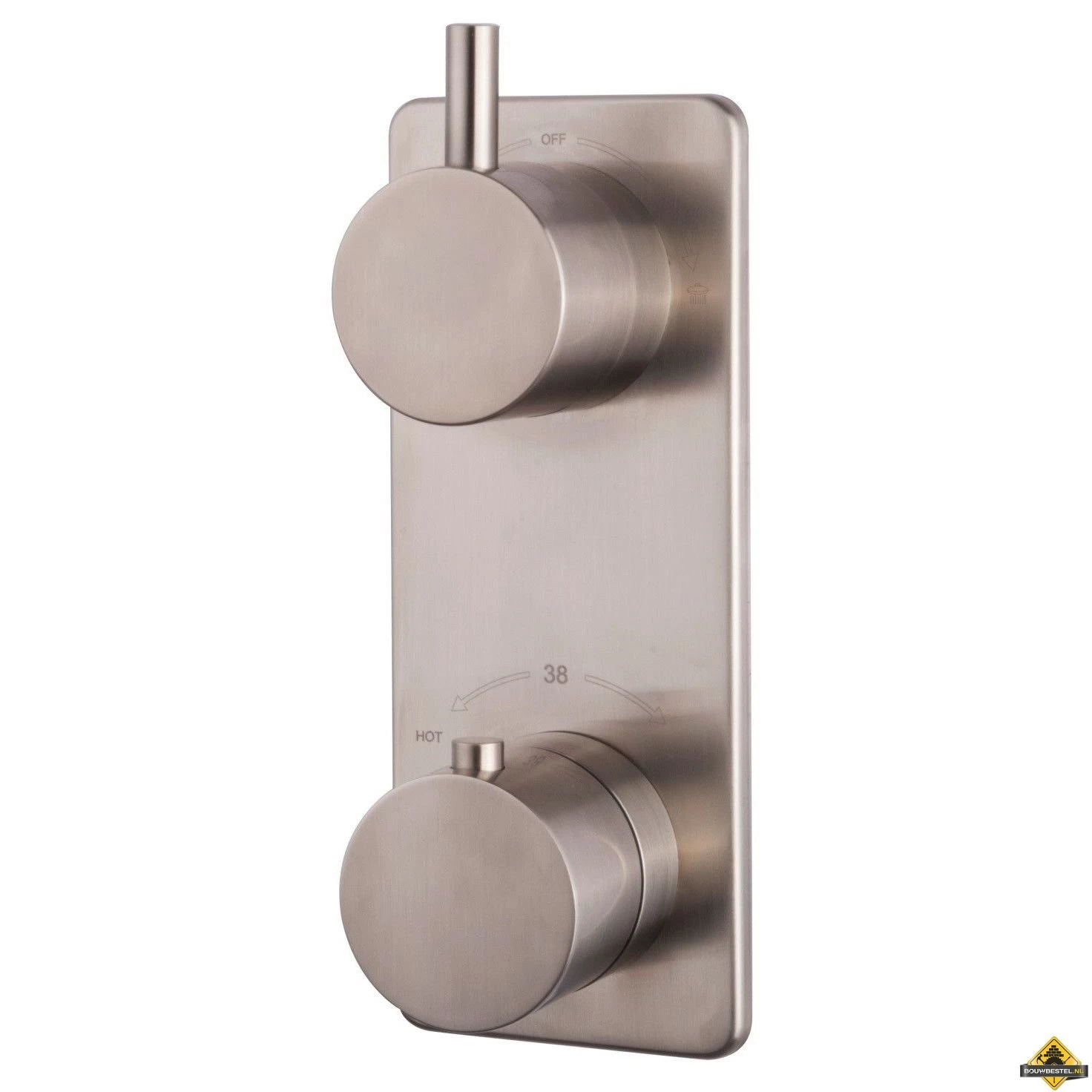 Deze thermostaat is vorzien van twee bedieningen. Een bediening is voor de thermostaat en de andere gebruikt u om de kraan mee aan of uit te zetten en u kunt bepalen welke van de twee aansluitingen u wilt gebruiken. Bijvoorbeeld om de handdouche of de hoofddouche aan te zetten. De aftappunten zijn niet gelijktijdig te gebruiken. Omdat de kraan thermostatisch is heeft de kraan een temperatuurbegrenzer. U voorkomt daardoor kans op verbranding bij bijvoorbeeld kleine kinderen. Daarnaast heeft de temperatuurregelaar een praktische eigenschap. U zet namelijk de kraan aan en het water krijgt de temperatuur zoals u die heeft ingesteld. De temperatuur blijft exact gelijk. Via thermostatische kleppen wordt het koude en hete water zo gemengd, dat het water een constante temperatuur heeft.