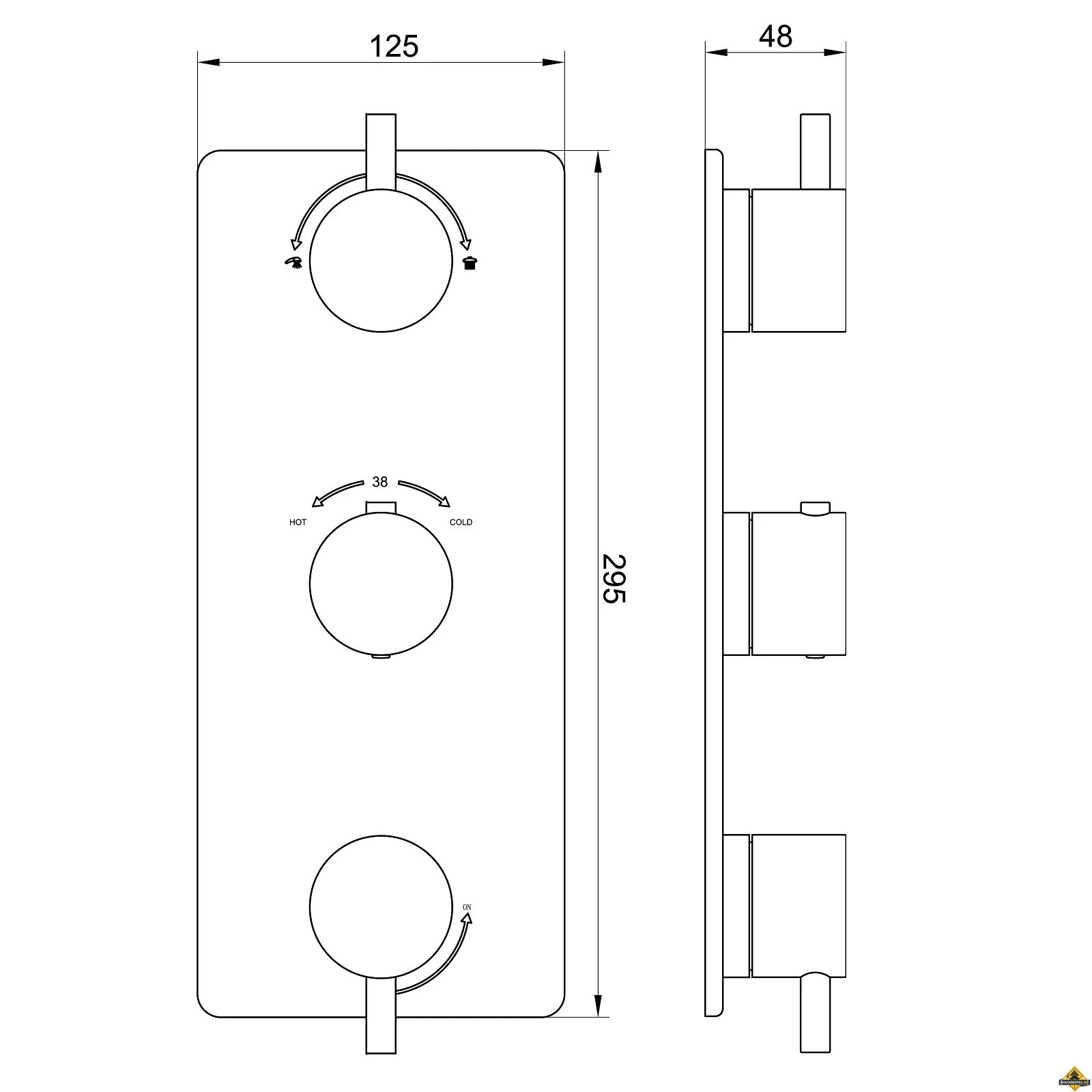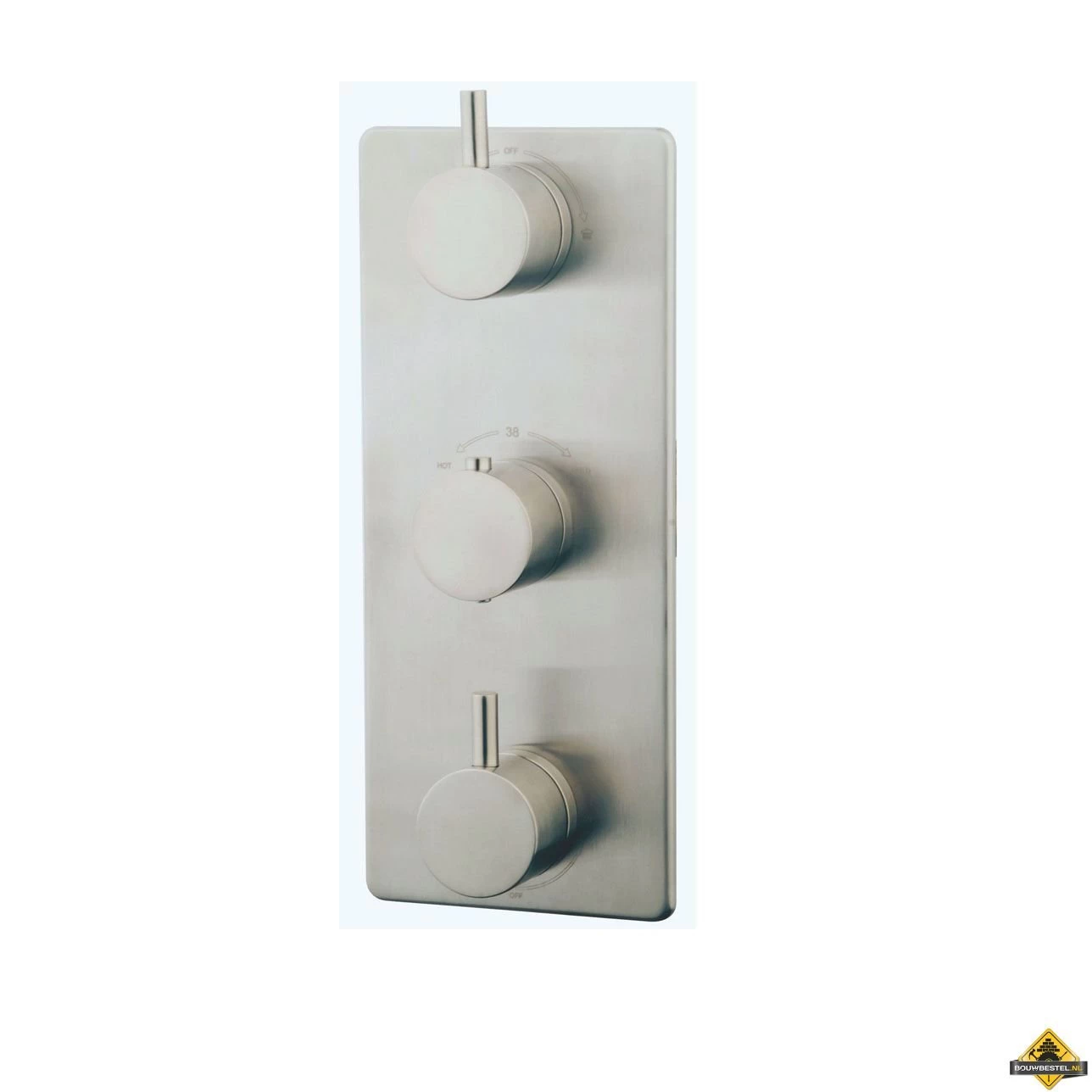 Deze afbouwset heeft een volledige finish van geborsteld staal. De Caral inbouw douchekraan afbouwset van Wiesbaden bestaat uit een thermostaatknop (hot/cold), twee omstelknoppen (hoofddouche/handdouche en aan/uit) en een bodemplaat.