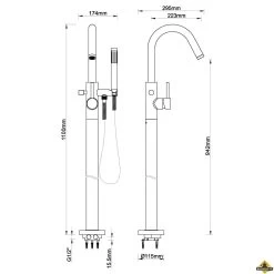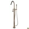 Caral vrijstaande badmengkraan compleet geborsteld messing. Deze vrijstaande Caral badmengkraan is van het populaire merk Wiesbaden en staat garant voor kwaliteit en design. Het betreft een complete set bestaande uit een badkraan, een handdouche en een doucheslang. Alle elementen van deze set zijn afgewerkt in de kleur geborsteld messing, wat een luxe uitstraling aan uw badkamer geeft. De badkraan wordt bediend met behulp van de greep, waarmee u zowel de temperatuur als de kracht van de waterstraal naar wens in kunt stellen. Tevens is er een omstelknop aanwezig waarmee u het gebruik van de handdouche in kunt stellen en vice-versa. De slang heeft een lengte van 150 cm.