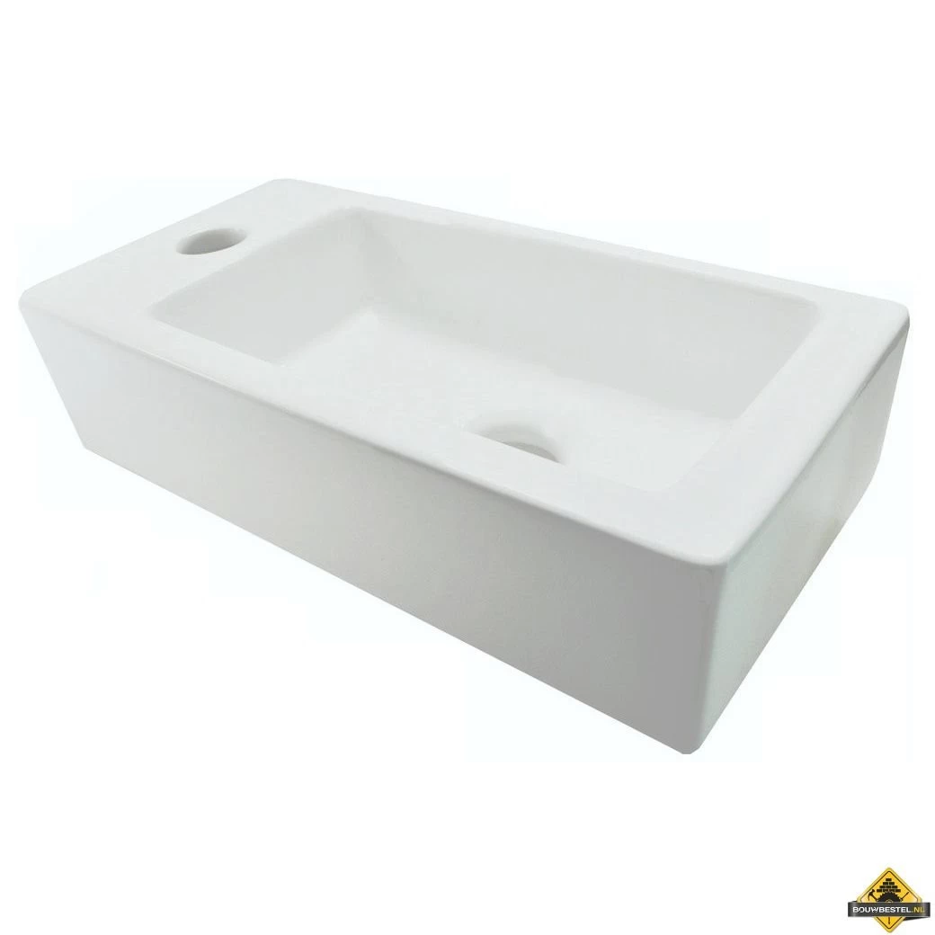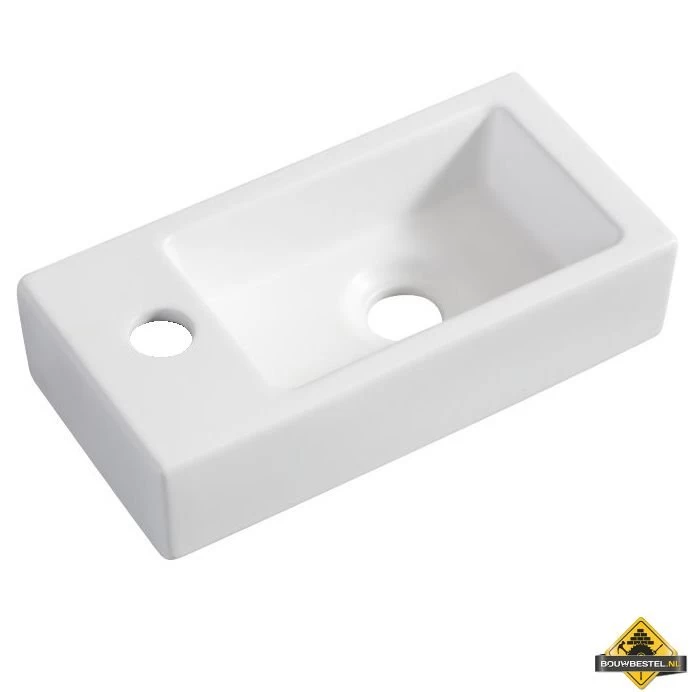 Wiesbaden mini fontein met het kraangat links. In de kleur wit. Past met zijn design en omvang in iedere badkamer of toiletruimte.