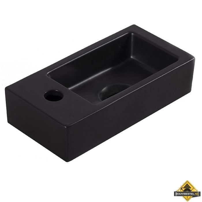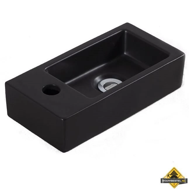Modern mat-zwart fonteintje met het kraan gat aan de linker zijde. Deze compacte fontein past perfect in ieder toilet.