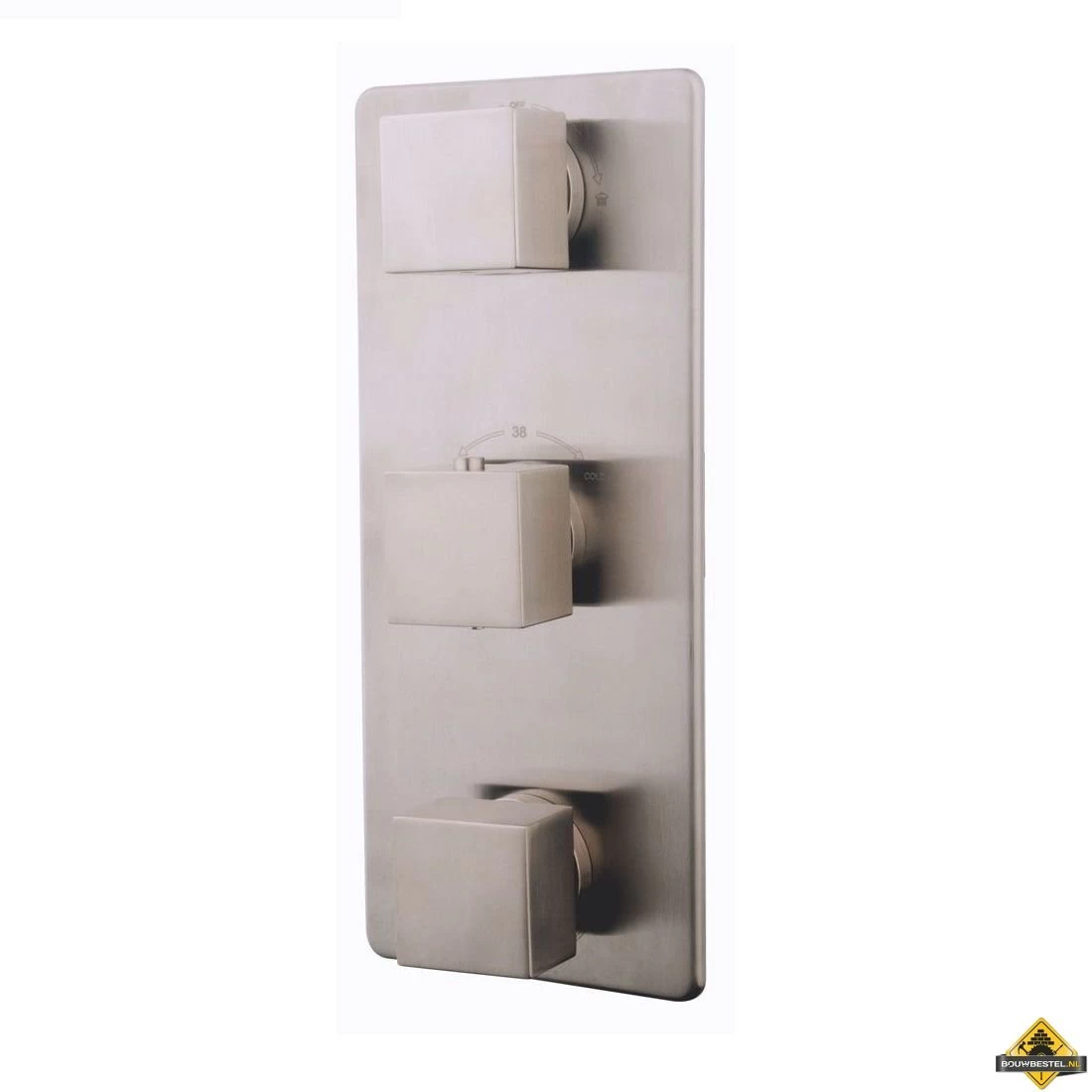 Deze afbouwset met vierkante knoppen heeft een volledige finish van geborsteld staal. De Rombo inbouw douchekraan afbouwset 3-weg RVS-look van Wiesbaden bestaat uit een thermostaatknop (hot/cold), twee omstelknoppen (bijvoorbeeld handdouche/hoofddouche en aan/uit) en een bodemplaat.