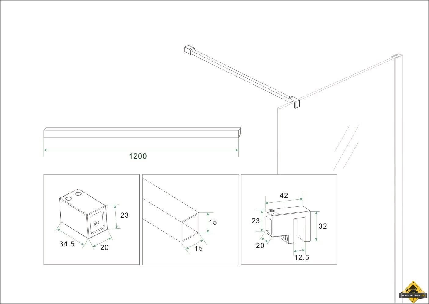 Set slim stabilisatiestangen messing tbv vrijstaande inloopdouche.