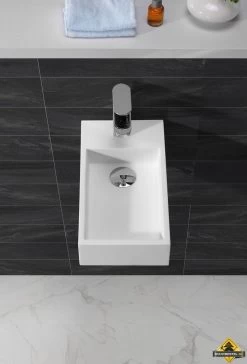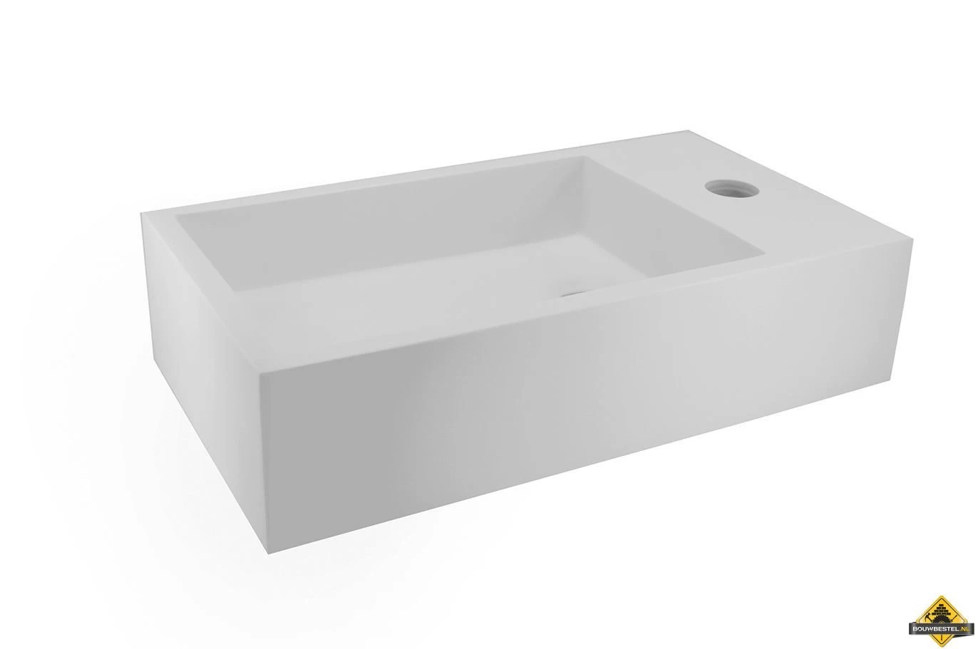 Deze fontein heeft een moderne en compacte uitstraling. U kunt deze losse fontein helemaal aanpassen aan uw eigen wensen. Kies uw favoriete kraan, sifon en waste en stel uw perfecte fontein samen. Sifon, kraan en waste zijn los verkrijgbaar. De kraan kan aan de rechterkant van deze fontein geplaatst worden. De fontein is gemaakt van Solid Surface. Hierdoor is de fontein slijtvast, vlekwerend en vochtbestendig. Bijtende stoffen kunnen de fontein niet aantasten en schoonmaakmiddelen zijn nauwelijks nodig. Solid Surface heeft een streepje voor. Het beschermt beter tegen schimmels en bacteriën, het is bestendiger tegen krassen en gaat langer mee.